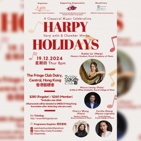 A Christmas recital in the heart of Hong Kong at the iconic Fringe Club! Performances include harp solo, harp and flute, voice and piano, and much more!