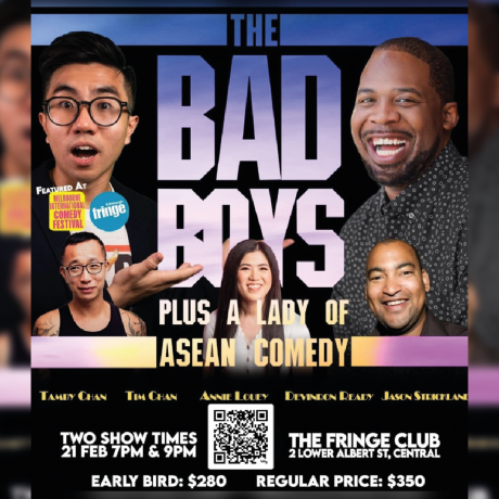 The Bad Boys of ASEAN Comedy are back with Tim Chan, who is quickly becoming a Hong Kong legend in the comedy scene with performances at the Edinbourgh and Melbourne Fringe Festivals. He will be joined by International comedian, Devinron Ready, Hong Kong comedy bad boy, Jason Strickland, Aussie comedian Annie Louey and host, Tamby Chan.