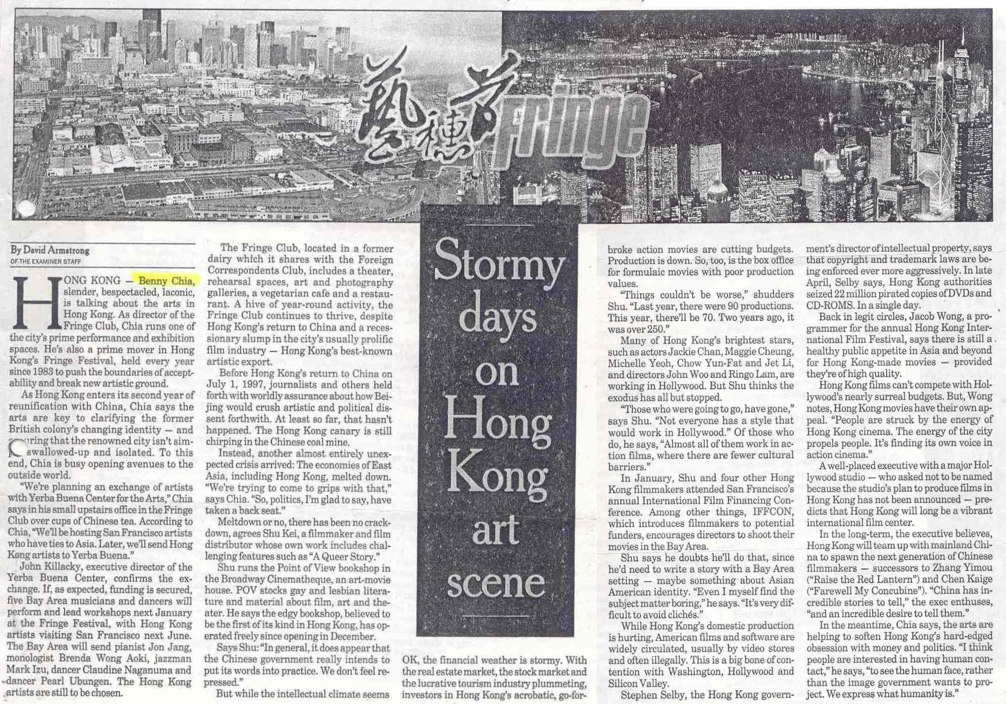 The year that we brought the curtain down on the Fringe Festival was also the year of the handover of Hong Kong by Britain to China in 1997. After that there was a palpable loss of interest in Hong Kong as a cultural destination because there were surprisingly no drastic incidents resulted from the handover.