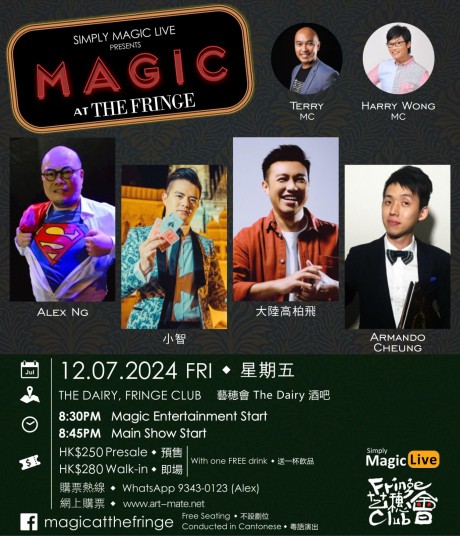 一班香港魔術師,將會齊集於中環藝穗會奶庫 The Dairy,獻上他們最熱愛和擅長的舞台和近景魔術!透過出神入化的技巧、秘密和心理學,加上強勁的顏值和魅力,全力轟擊每一位現場觀眾的五感及心靈深處,並為大家帶來無限的可能性!